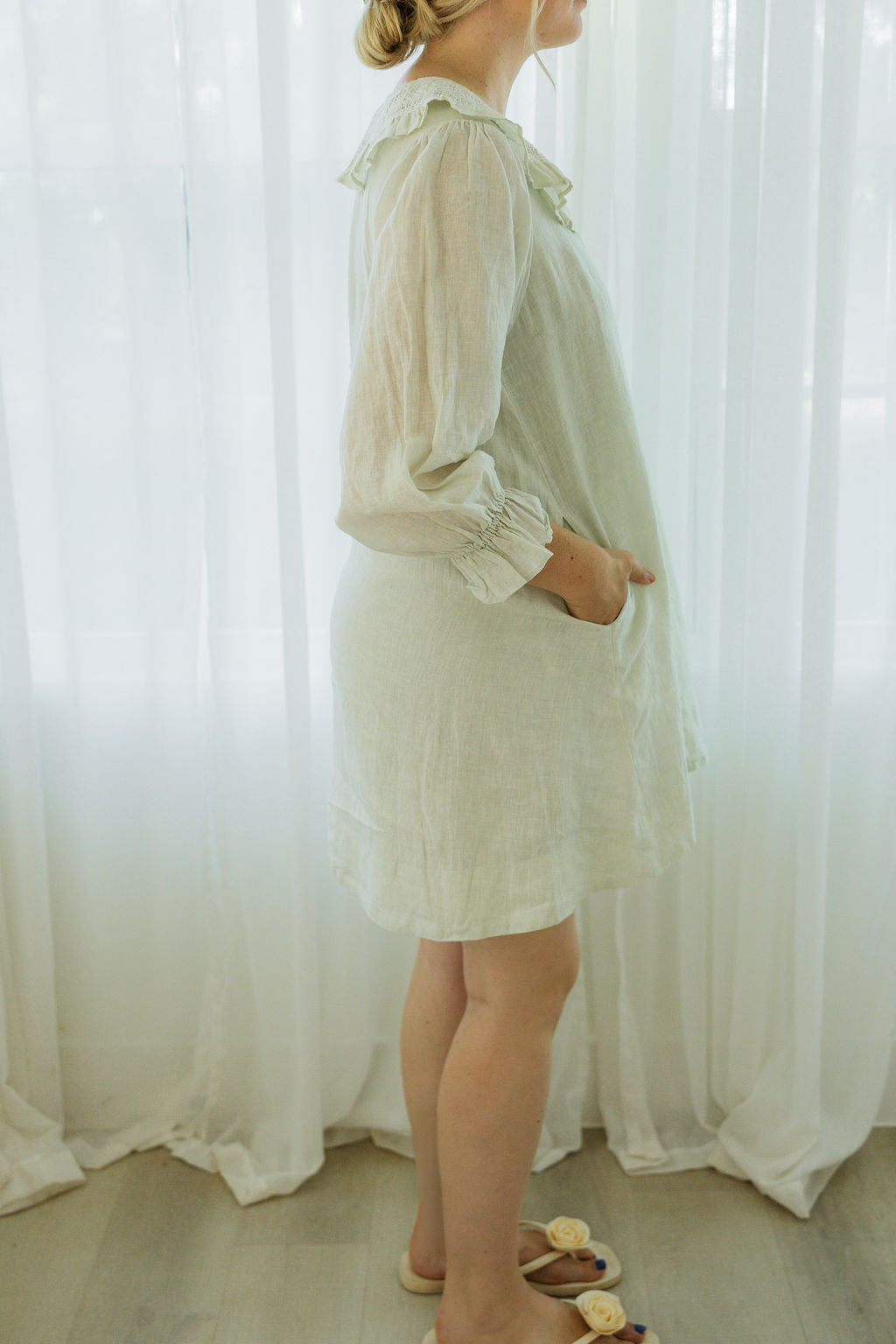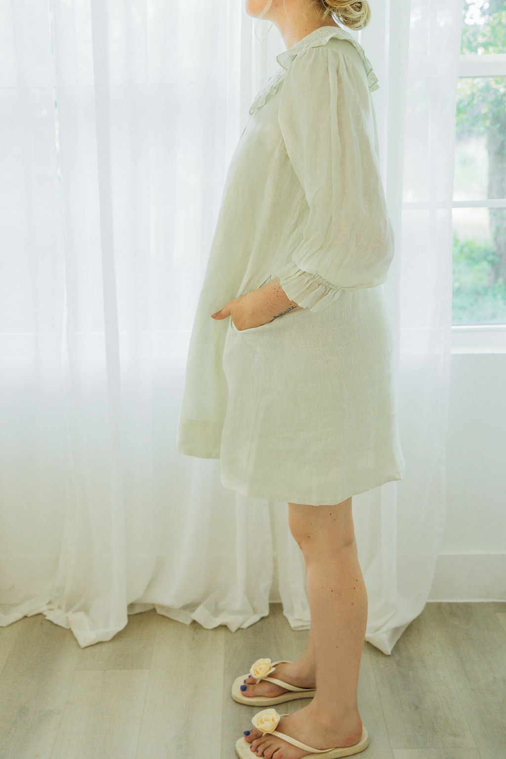 The Josie Mini Dress is a blend of charm and comfort, crafted in 100% eucalyptus green linen and fully lined in cotton. Its easy swing silhouette features side seam pockets that flatter without adding bulk, while 3/4 gathered sleeves bring a romantic touch. A rounded neckline is finished with delicate contrast smocking in natural white and a tassel tie that can be worn loose or tied for a softer look. With a wide border hem and effortless drape, Josie is made for everyday wear that feels special.