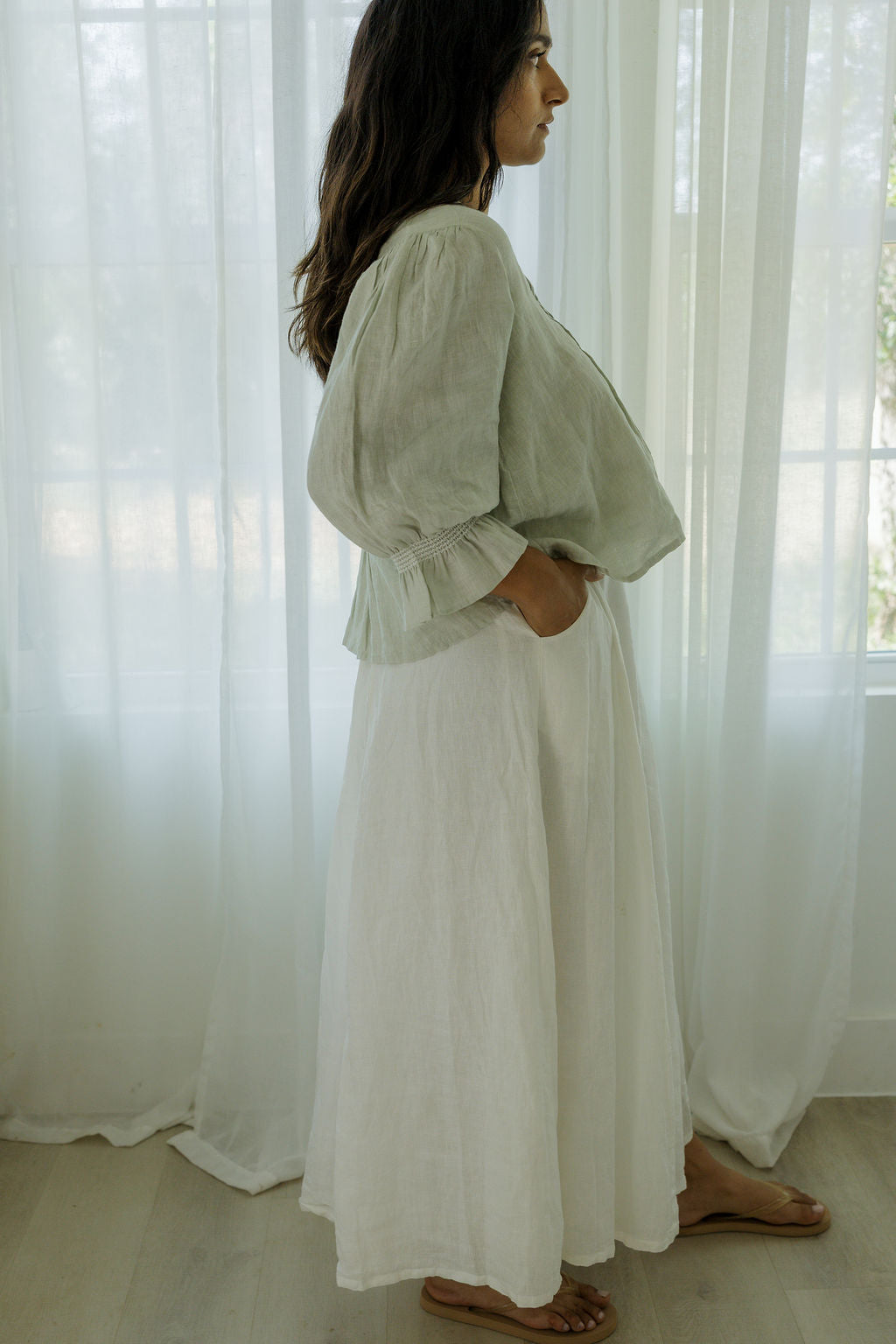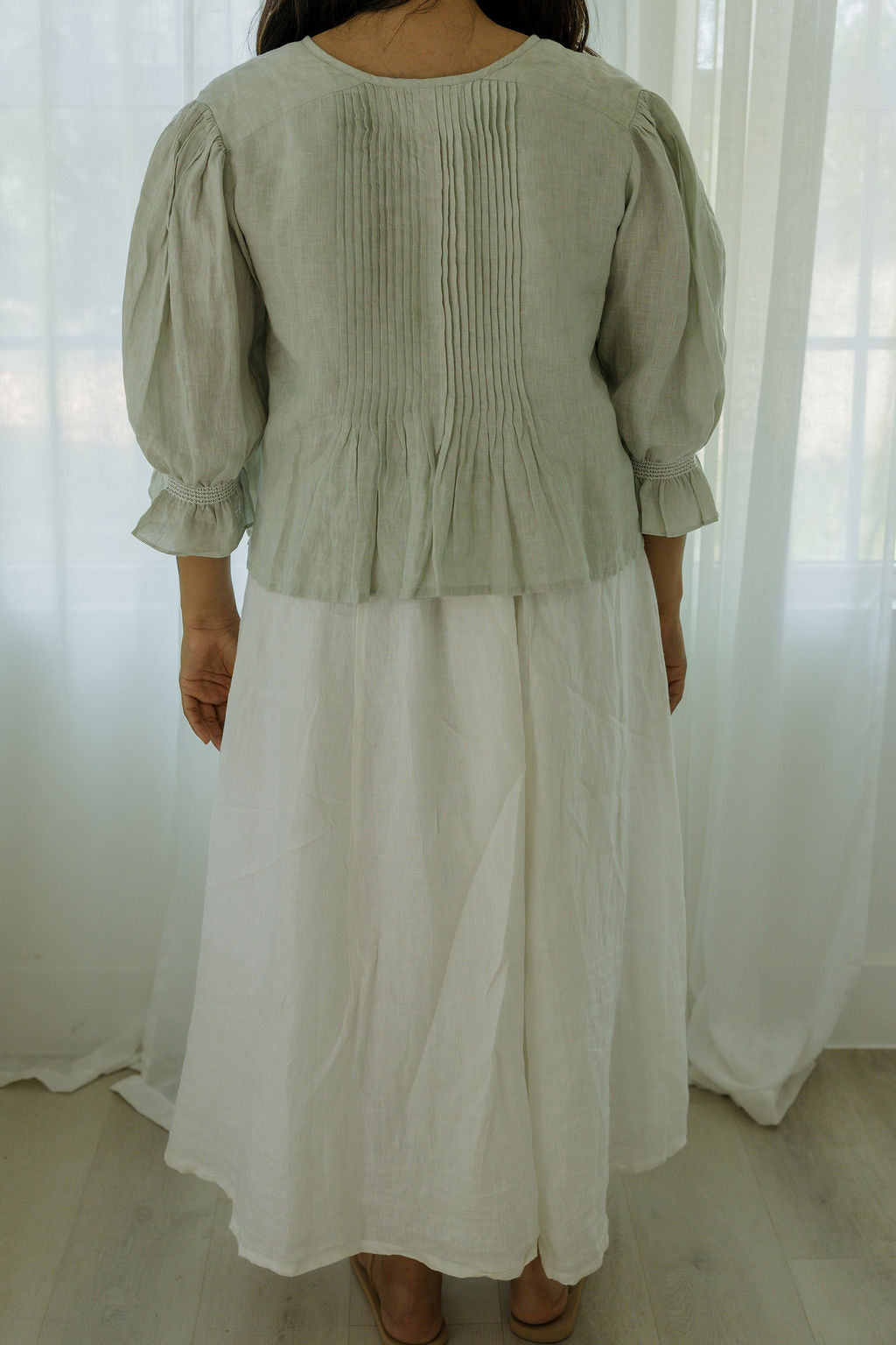 The Libbie Blouse is an easy blend of romance and refinement. Crafted in soft eucalyptus green linen and fully lined for comfort, it features delicate pintucks along the front and back, a flattering V-neckline, and smocked 3/4 sleeves with contrast white stitching. Effortless to style and made to move with you, this blouse pairs beautifully with everything from skirts to denim.