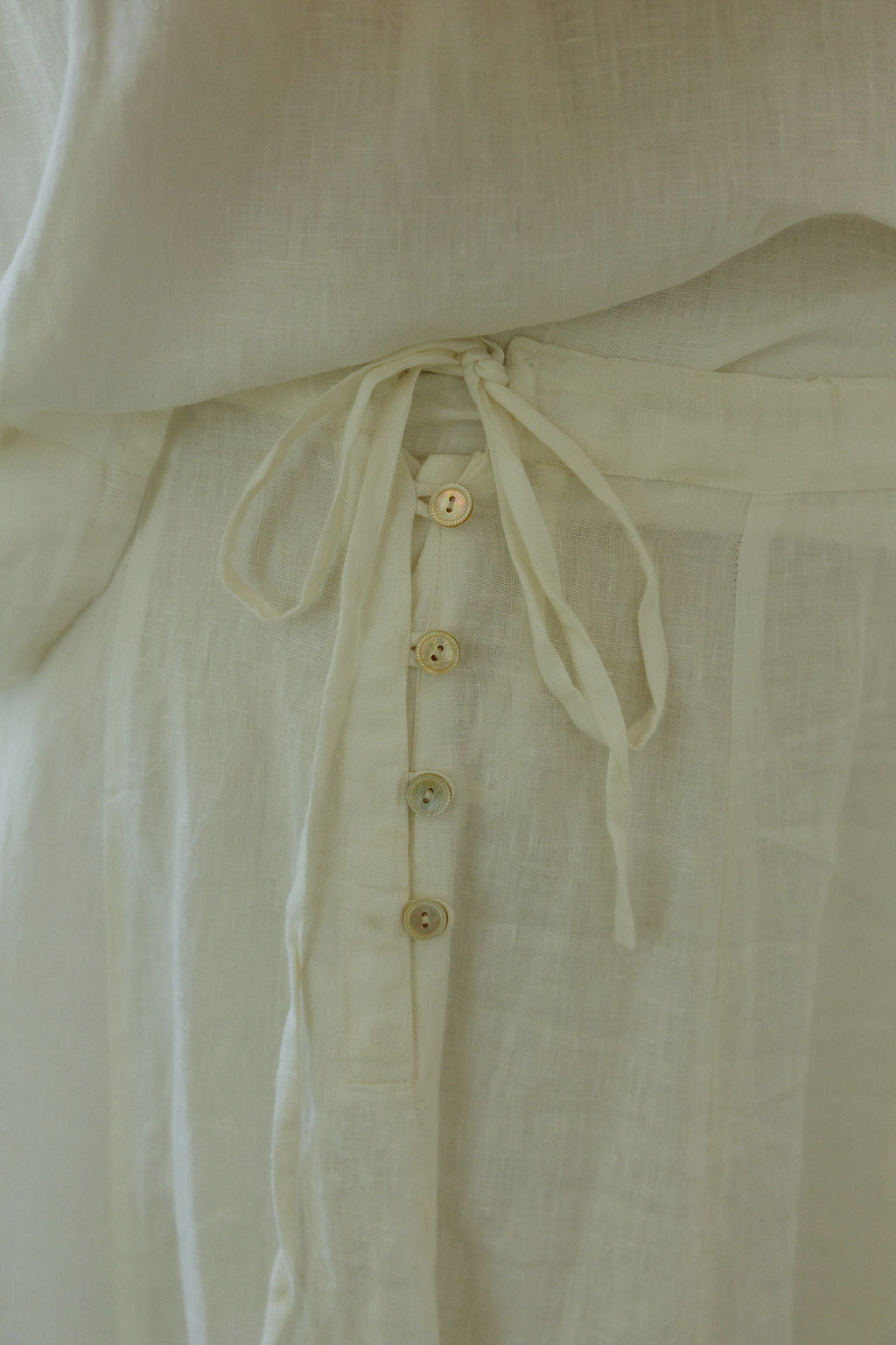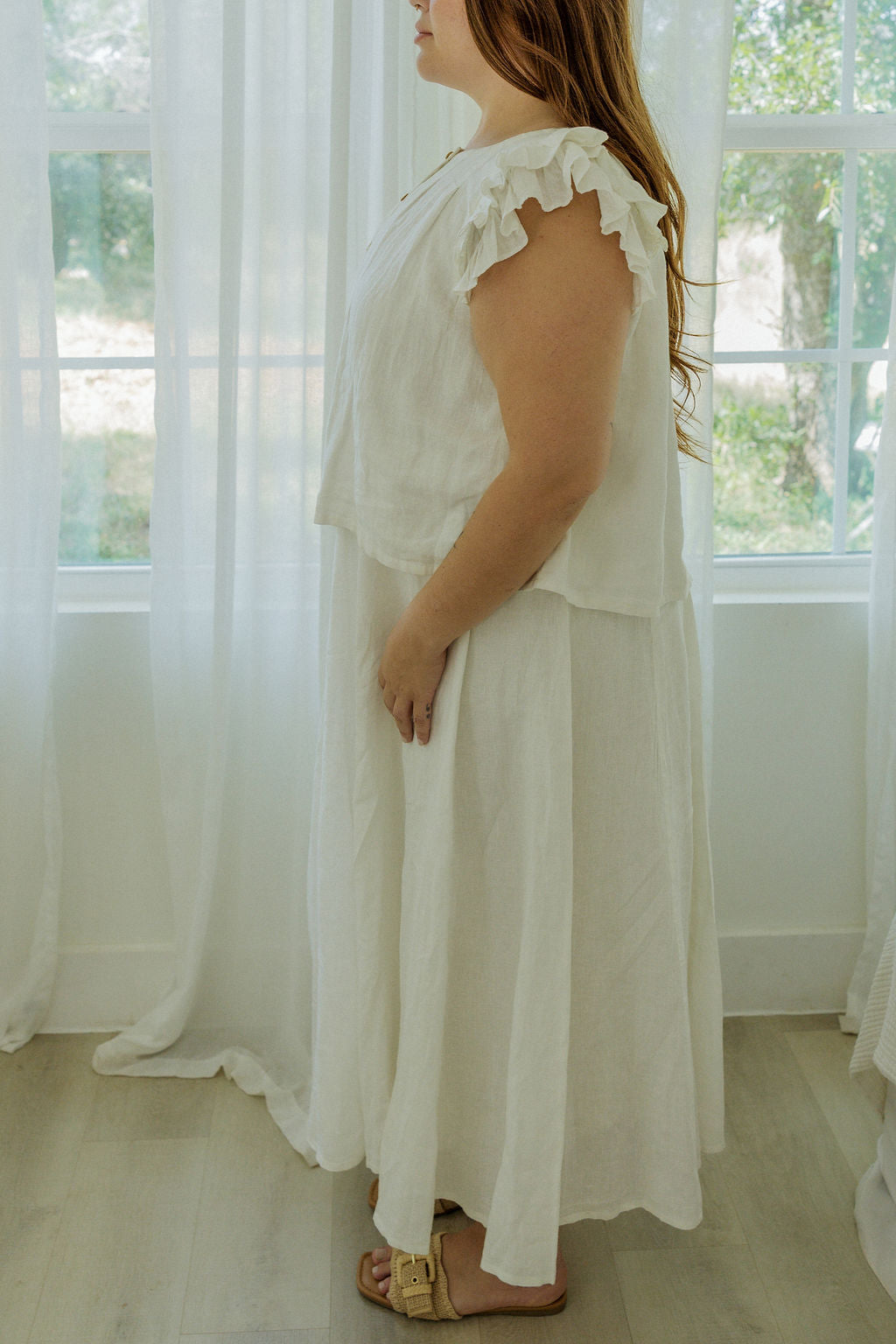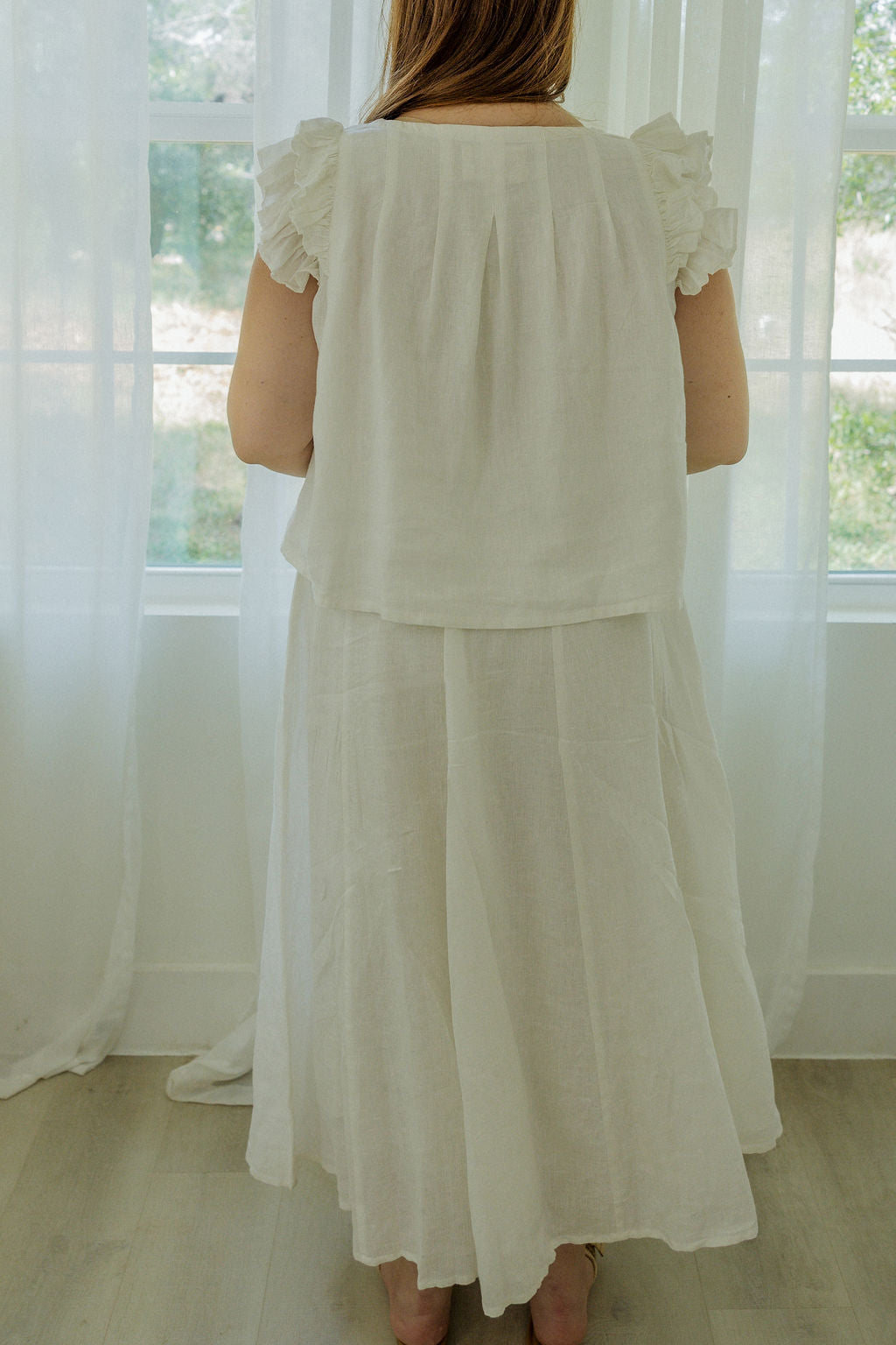 The May Maxi Skirt is breezy, elegant, and full of thoughtful detail. Crafted in natural white linen and fully lined in cotton, it drapes with a beautiful full sweep and sits lower on the waist for an easy, relaxed fit. Side shell buttons and a tassel tie add a playful touch—perfect for styling with a tucked-in blouse to show off the detail. Paneled seams run the length of the skirt, giving it subtle movement and texture. A timeless skirt designed to move with you through every season.