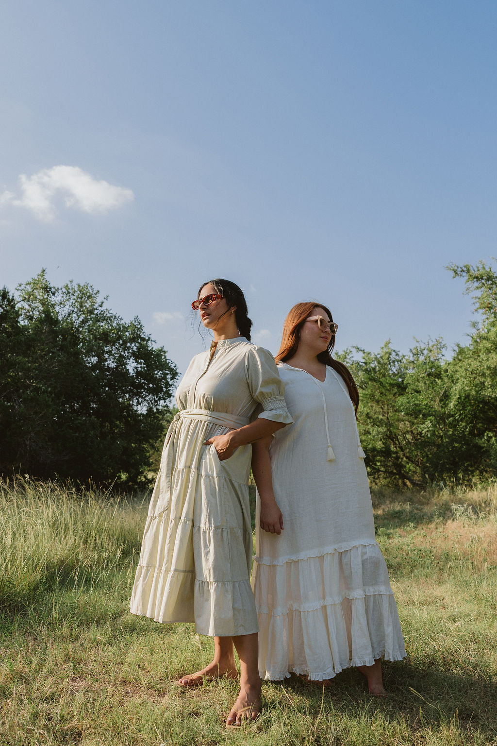 The Moxie Midi Dress is playful, easy, and designed for everyday wear. Crafted in soft cotton, it features a tiered swing skirt with plenty of movement, side pockets that flatter without adding bulk, and a rounded neckline with a shell button bodice. Puff sleeves with delicate natural white smocking and a gentle ruffle cuff bring a romantic touch. Unlined and breathable, Moxie is the dress you’ll slip into all season long.